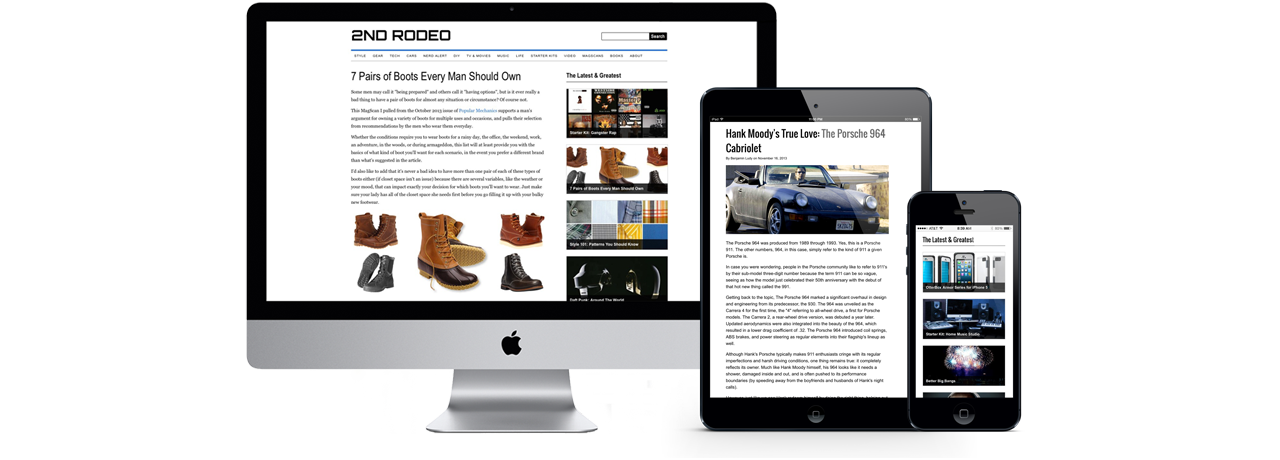 2nd Rodeo is a resource for guys, a collaboration of information including style, cars, gear, technology, entertainment, DIY, and more. It is a type of meta-analysis, or possibly even a "best practices" guide, of our modern culture. Content you are likely to see on 2nd Rodeo ranges from music recommendations and product reviews to suit fit guides and DIY tutorials.